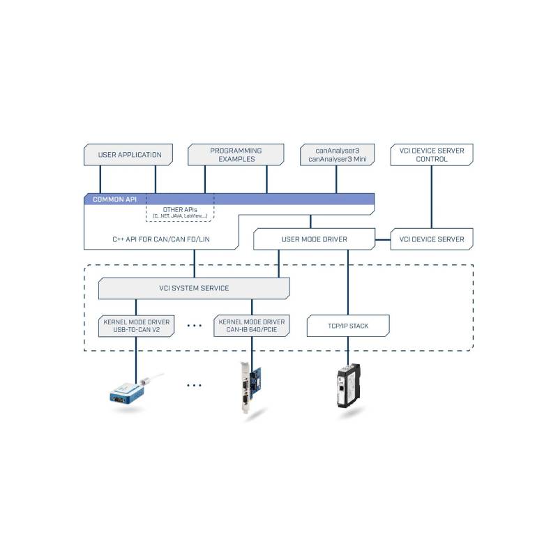 - Powerful programming interface for Windows (VCI) as well as for Linux (socket CAN or ECI), QNX and VxWorks (ECI)